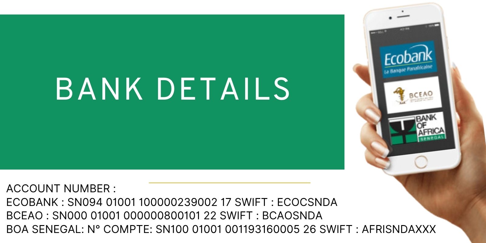 Payment can be made at any ECOBANK branch in your country (please specify that it concerns an account opened at ECOBANK Senegal—see address in the RIB). Be sure to use all 24 characters to indicate the account number and also include the SWIFT code.
